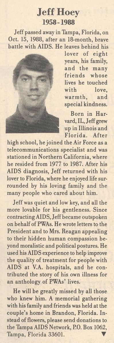 Jeff was my roommate in College. He was sweet, soft spoken and funny. After Jeff got sick he moved to Tampa, Florida with his lover Marco. I visited them there frequently. They bought a beautiful house and build a comfortable life surrounded by Jeff's family and their many friends. Marco worked and Jeff kept an immaculate house even as his health deteriorated. After Jeff died Marco had several boyfriends that all looked like Jeff, but no one could replace him in his heart. Marco died five years after Jeff. I hope they are together again somewhere. |